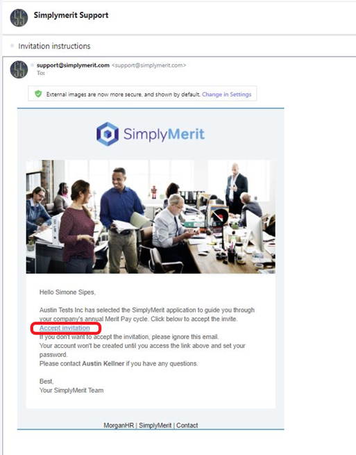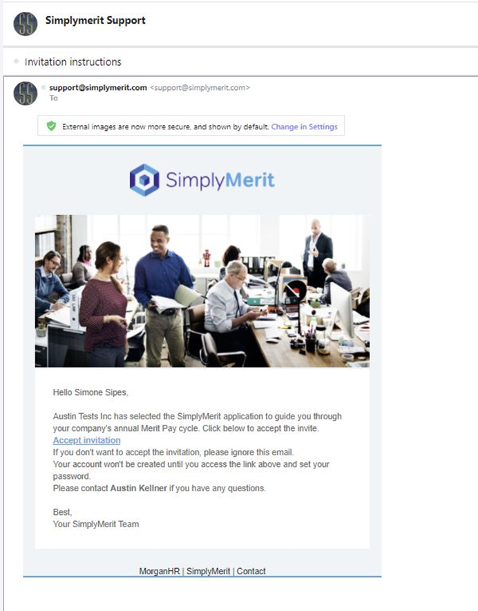 An “Invitation instructions” email from Support@SimplyMerit.com will be received by the employees who are invited into SimplyMerit.