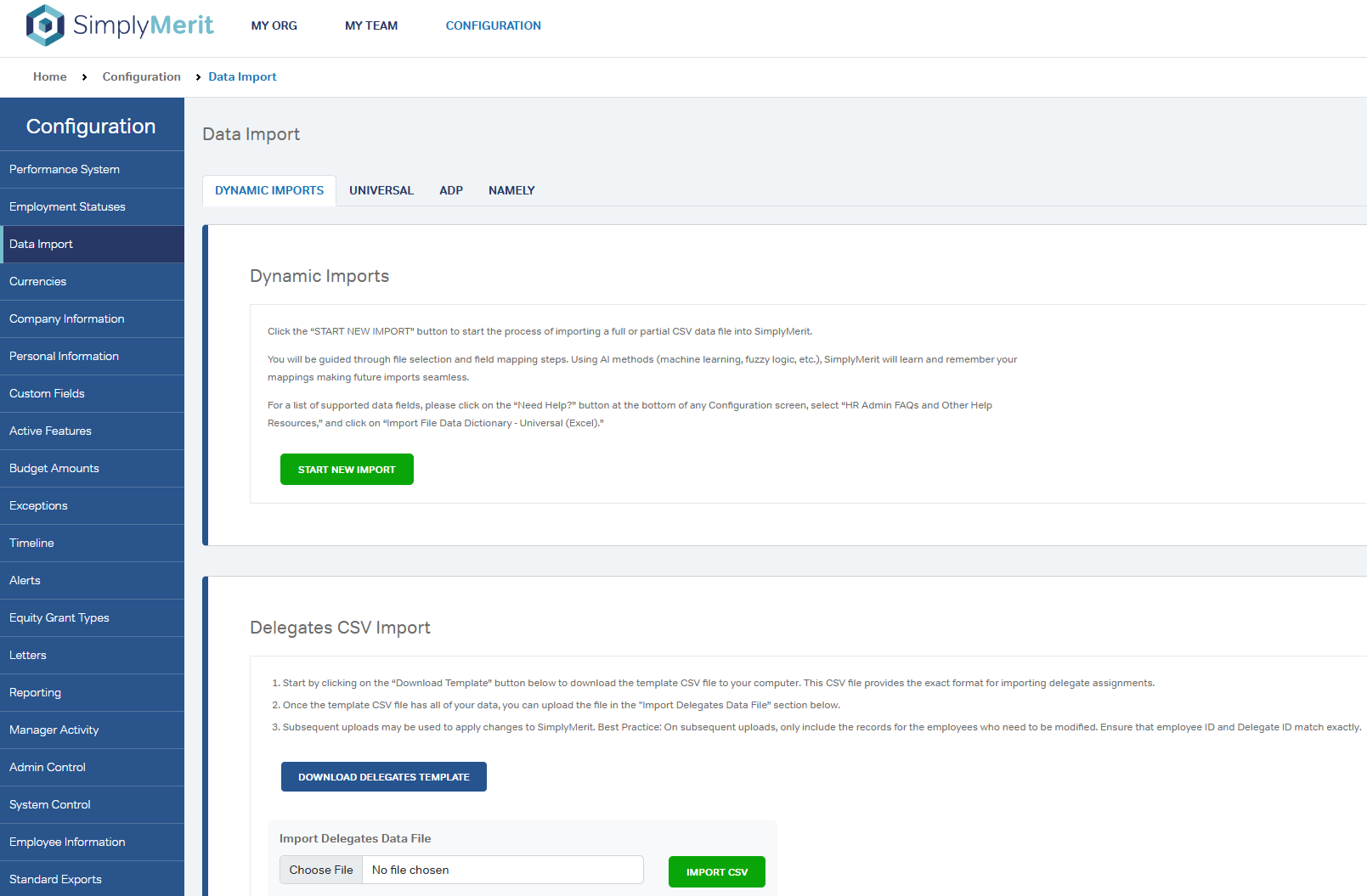 SimplyMerit provides multiple data import paths to support different HRIS systems and data types. Dynamic Imports are the recommended approach for most scenarios, while specialized CSV imports and HRIS-specific tools support targeted use cases.