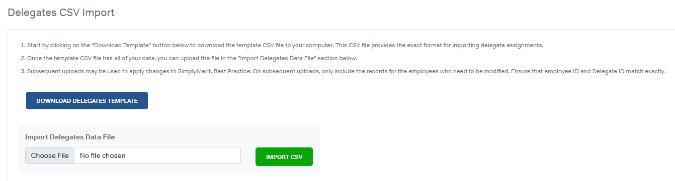 On subsequent uploads, include only records that need to be changed. Ensure Employee ID and Delegate ID match exactly.