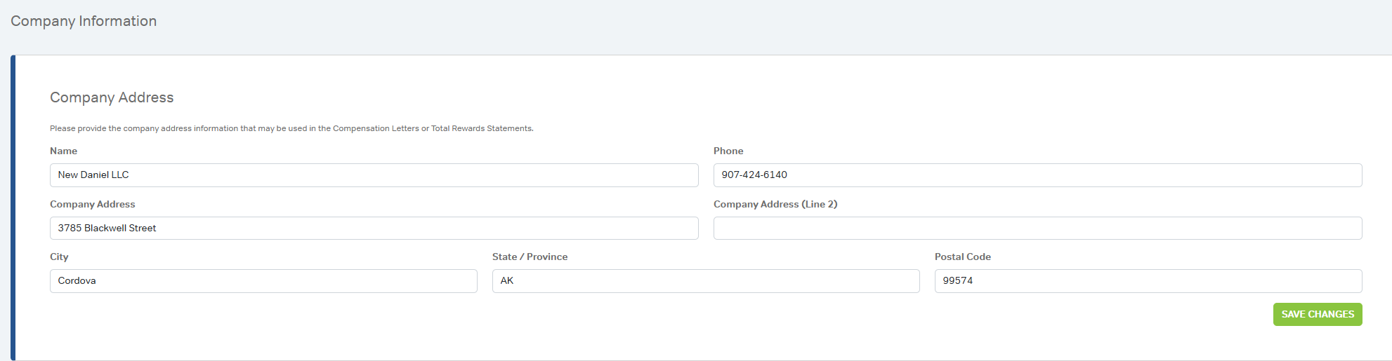 The Company Information section allows HR Administrators to enter basic company details that may be used in employee-facing documents such as compensation letters or Total Rewards statements. This configuration is optional and does not affect system functionality or calculations.