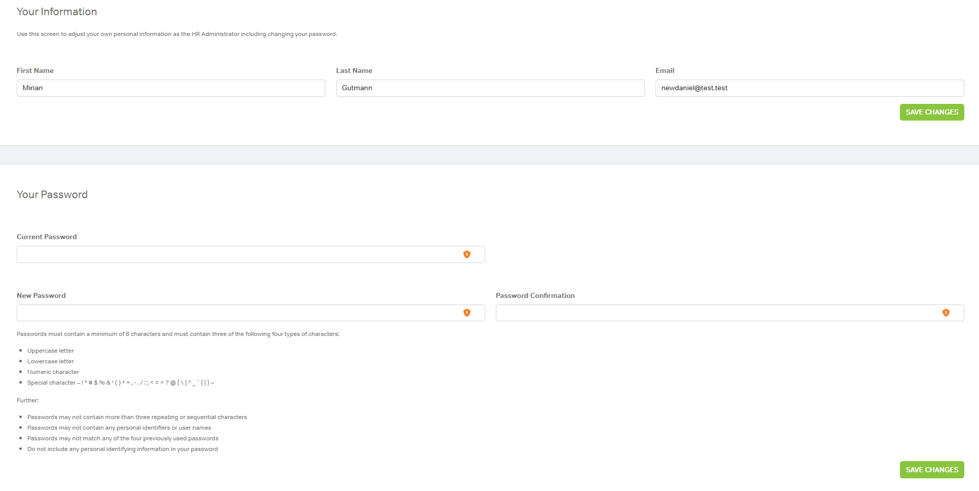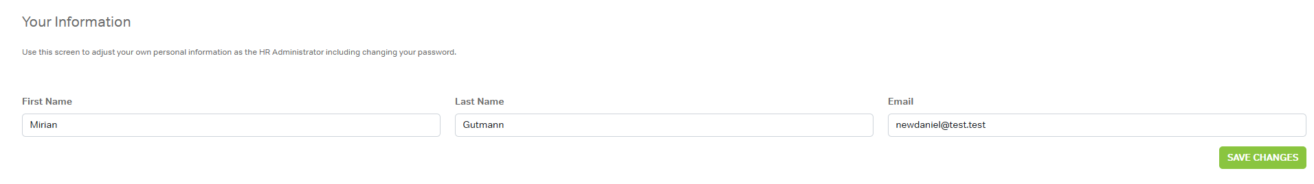 The Personal Information section allows HR Administrators to manage their own user details within SimplyMerit, including updating their name, email address, and password. Changes made here apply only to the currently logged-in user.