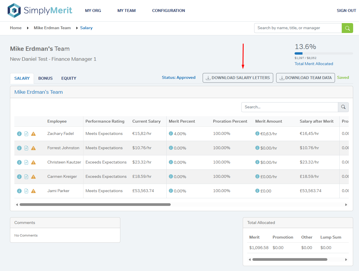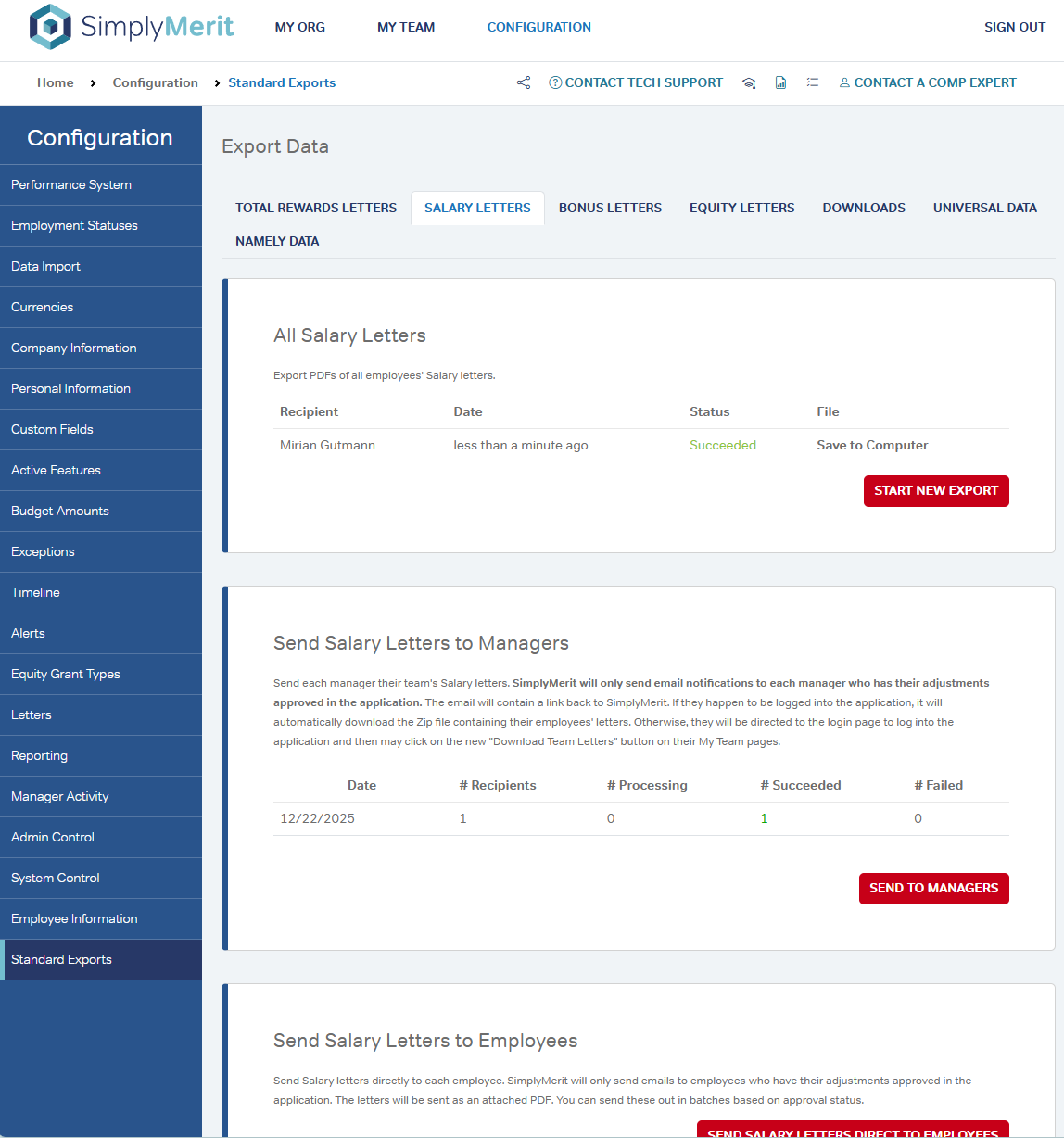 SimplyMerit provides multiple methods for distributing Salary, Bonus, Equity, and Total Rewards letters, allowing administrators to export letters in bulk, route them through managers, or send them directly to employees once approvals are complete.