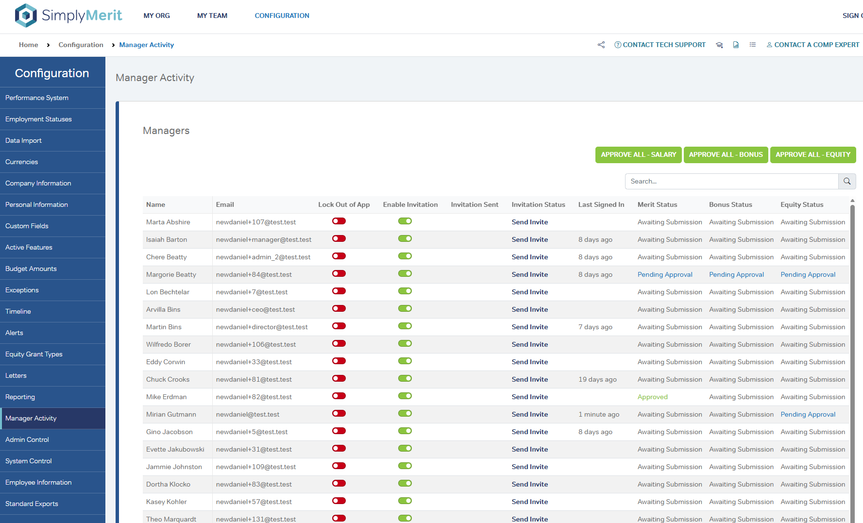 The Manager Activity section provides administrators with real-time visibility and control over manager participation, submission progress, and approval status across the compensation cycle. This page is used to monitor engagement, manage access, and perform bulk administrative actions when needed.