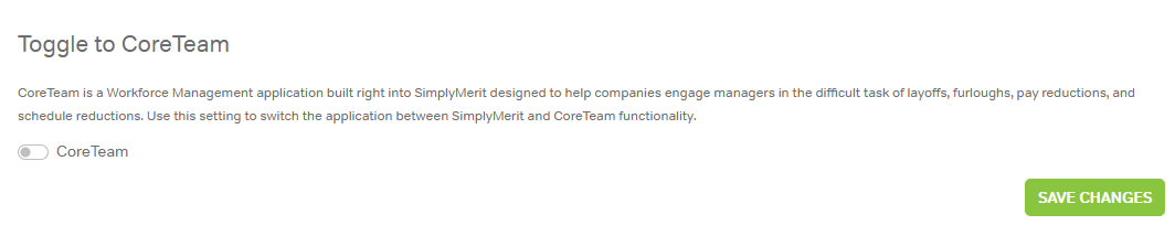 Enabling this toggle switches the application from standard SimplyMerit compensation workflows to CoreTeam functionality. It is not recommended to use this unless you are 100% certain.