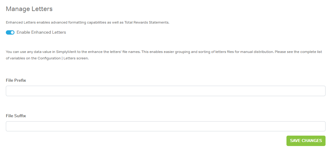 The Manage Letters section controls enhanced letter functionality and file naming.