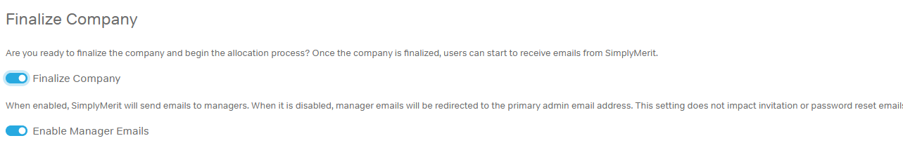 Finalizing the company transitions SimplyMerit from configuration into an active allocation cycle.