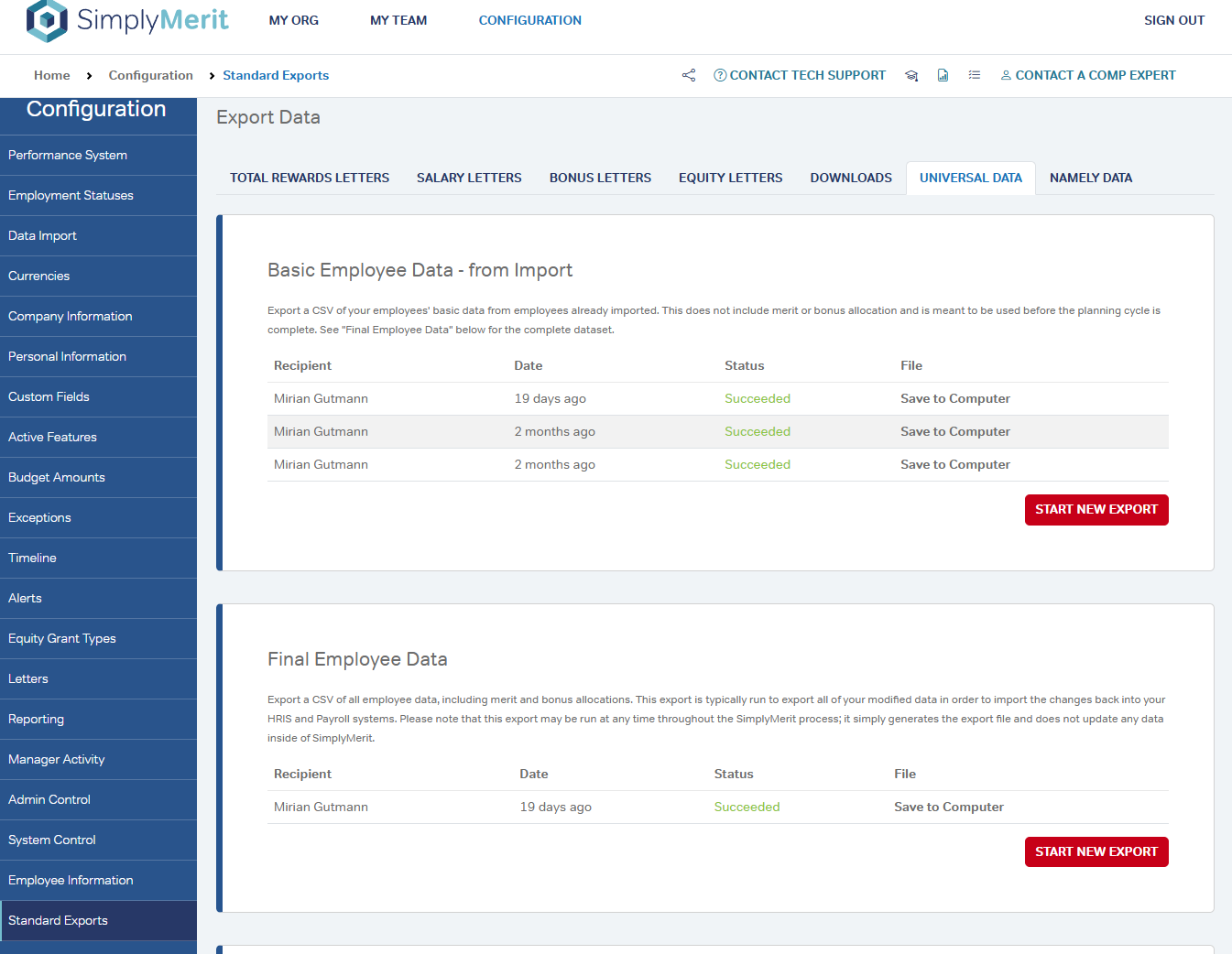 The Standard Exports page is used to export employee data and adjustment letters from SimplyMerit. Exports can be run at any time and as often as needed—running an export does not set flags, lock features, or change data.