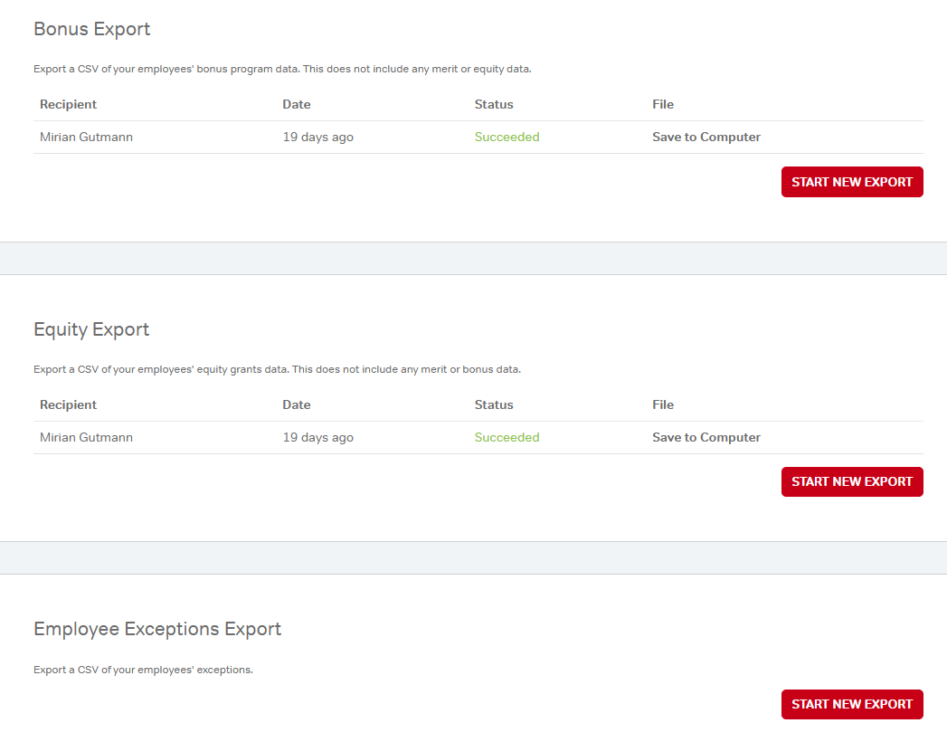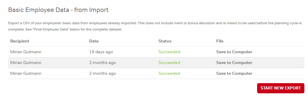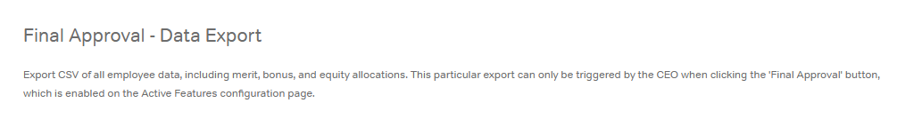 When the merit and/or bonus cycle is complete, this export outputs employee data, including merit adjustments, bonus allocations, comments, and more, intended for feeding updates back into HRIS/payroll systems.