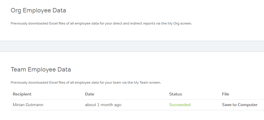 The Downloads tab lists previously generated files (data exports and/or other downloadable output depending on your enabled modules) ran from the My Org and My Team pages.