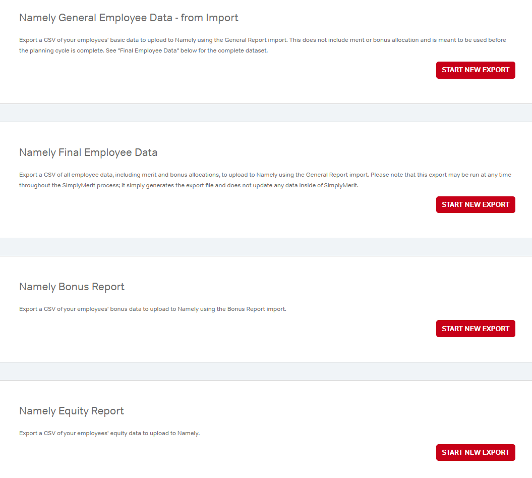 The Namely Data tab provides exports formatted for Namely conventions and can also be used as part of the Namely import/export workflow.