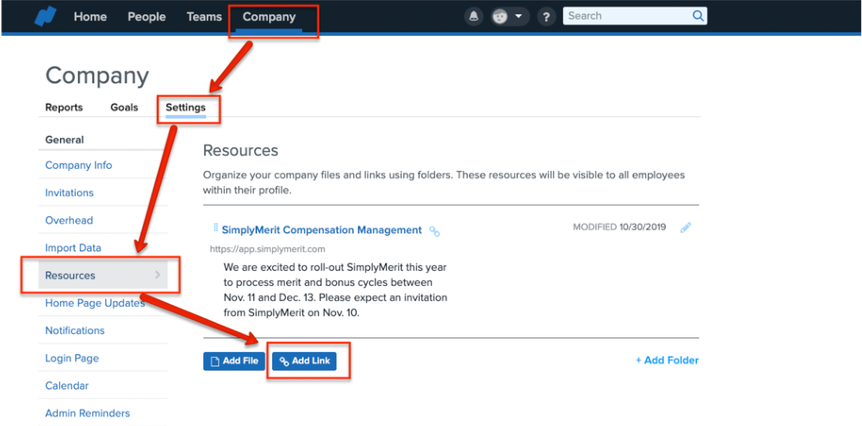 SimplyMerit can be integrated directly within the Namely user interface by adding a link to the Resources menu within Namely. The following illustrates how to do this: