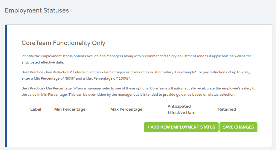 The Employee Statuses page is only to be used when configuring the CoreTeam version of SimplyMerit to assist with layoffs, furloughs, and pay reductions. For more information about CoreTeam, please contact us a hello@morganhr.com.