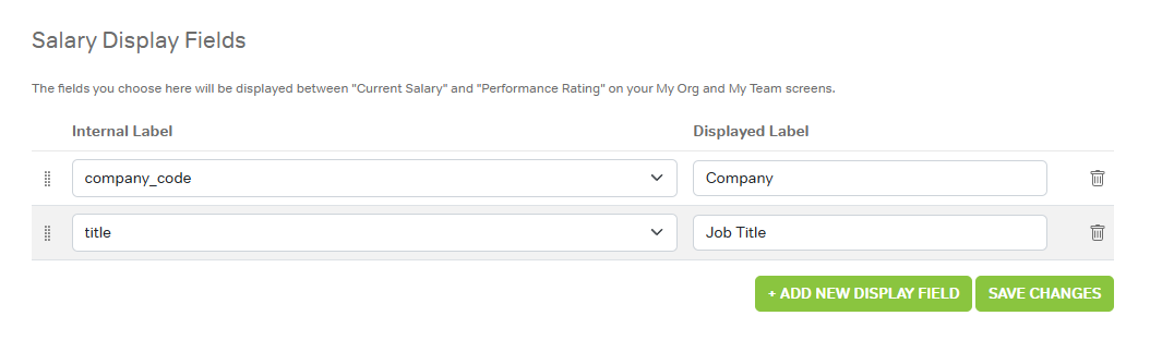 The Display Fields settings in Configuration → Active Features control which informational fields managers see across My Org and My Team views for Salary, Bonus, and Equity.