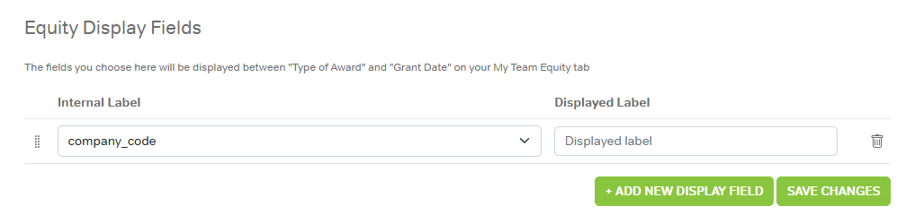 Equity Display Fields control additional grant metadata fields displayed between Type of Award and Grant Date.